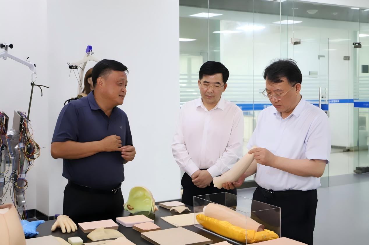 羅云峰先后來到人形機器人柔性皮膚展廳、人形機器人皮膚研發實驗室,實地查看公司自主研發的多代柔性皮膚樣品,詳細了解材料合成、結構設計、傳感集成與功能測試的全流程研發過程。李維虎博士介紹了公司在高性能仿生材料、多模態感知(觸覺、溫度)等核心技術上的突破與優勢,闡述了材料在環境適應性、耐用性及高效信號傳導方面的性能與應用,講解了柔性皮膚在人形機器人智能陪伴、高端醫療等領域的應用前景及產業化成果。